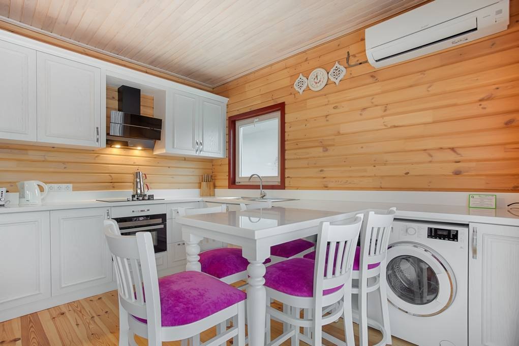 Kitchen; dinner table for 2, refrigerator, washing maschine, laundry maschine, built-in oven, microwave oven, toast machine, water heater, kitchen equipments