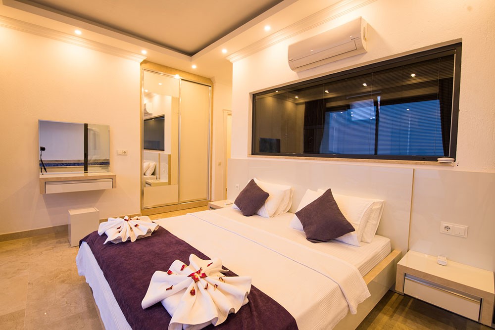 1st bedroom contains 1 double bed, hot tub, indoor pool, wardrobe, a dressing table with mirror, bathroom , air condition