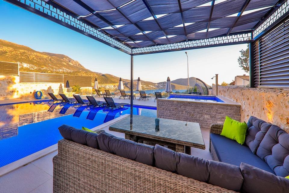 Our luxury Villa Dry White located in Ortaalan Area in Kalkan has 10 guest capacity with 5 bedrooms, one of them with jacuzzi . The living area is furnished with contemporary elements with American style kitchen. Our luxury villa is built by adoptation of modern architecture understanding; and items of quality were used in the interior design.