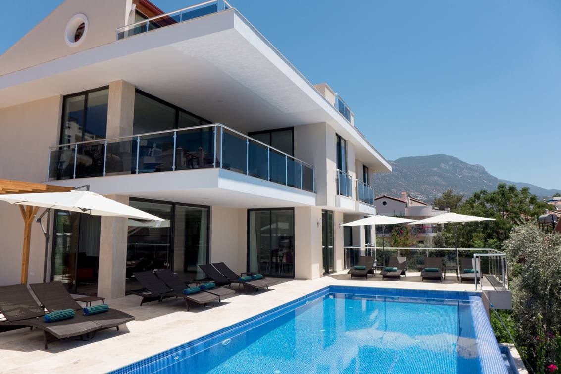 Our luxury Villa Greenscape located in Kalkan area has 14 people capacity with 7 bedrooms with nature and sea view. At the living area, there are well modern design lounge groups and American style kitchen. Our luxury villa are built with modern architecture understanding and quality items were used in the interior design. Also there is outdoor jacuzzi which you can relax with the magnificent sea and nature view. It is appropriate for large friends groups and families.