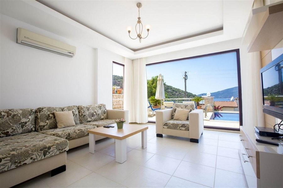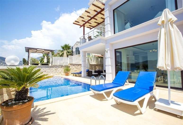 Our luxury Villa Gulbay located in centre of Kalkan has 6 guest capacity with 3 bedroom, one of them with jacuzzi. Also there is sauna.The living area is furnished with contemporary elements with American style kitchen. Our luxury villa is built by adoptation of modern architecture understanding; and items of quality were used in the interior design.