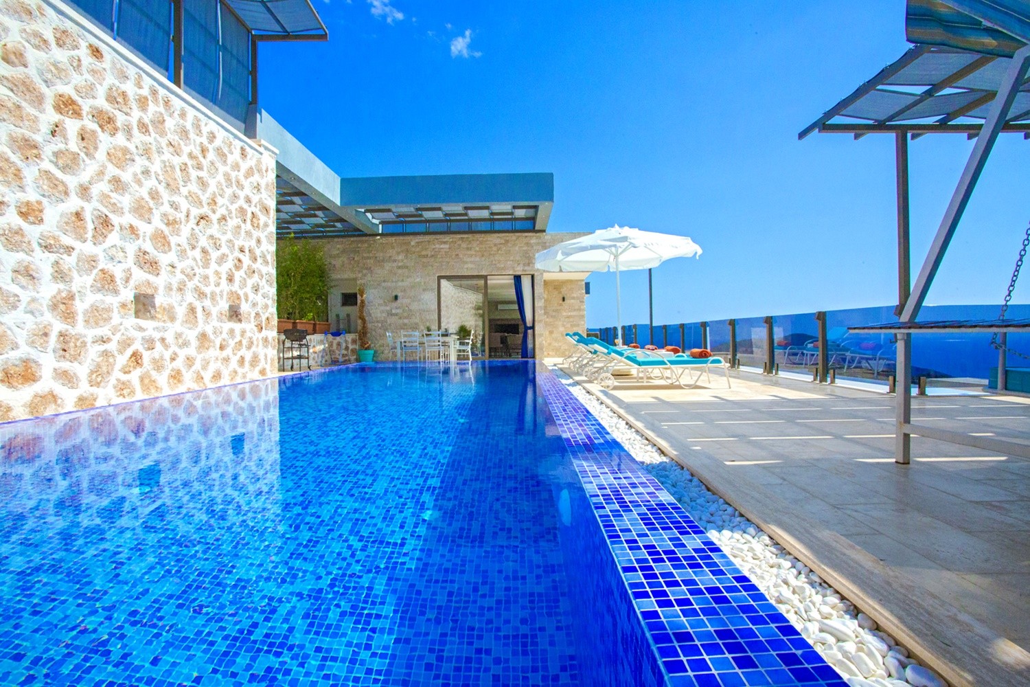 Private pool ( length: 3.70 m, width: 11.50 m, depth: 1.60 m), indoor pool(length: 4.00 m, width: 9.00 m, depth: 1.60 m), kiddie pool (length: 2.00 m, width: 1.50 m, depth: 0.50 m) sun beds, beach umbrella, shower, seating groups, table and chair
